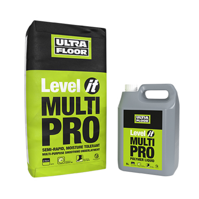 UltraFloor Level IT Multi Pro is a rapid curing, high performance free flowing two-part smoothing underlayment. It incorporates Envirobead® technology which is made with 20% recycled material for improved application and reduced environmental impact. It consists of a powdered component incorporating a blend of high specification cements, graded fillers and additives and a pre-gauged high polymer content liquid component. UltraFloor Level IT Multi Pro is suitable for depths between 2-15mm.